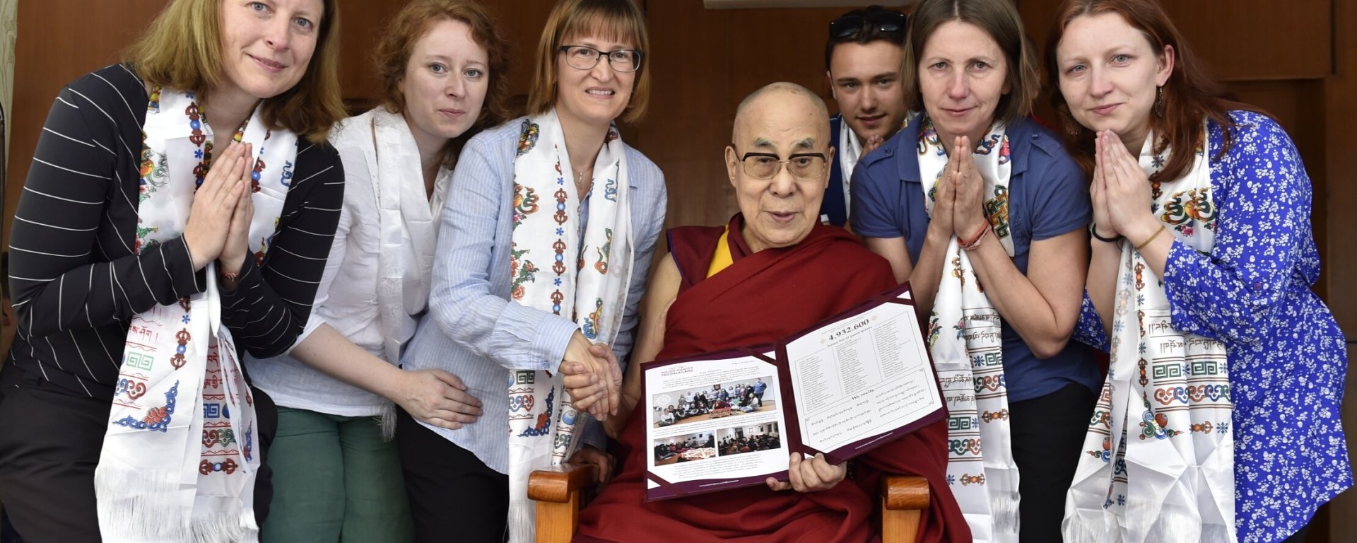 Vaše Svatosti, přijeli jsme sem dnes proto, abychom vám předali pozdravy z České republiky. Jsme skupinka šesti lidí, kteří reprezentují 68 lidí z České republiky, kteří za váš dlouhý život nastřádali téměř 5 milionů manter, a všechny ostatní vaše příznivce.